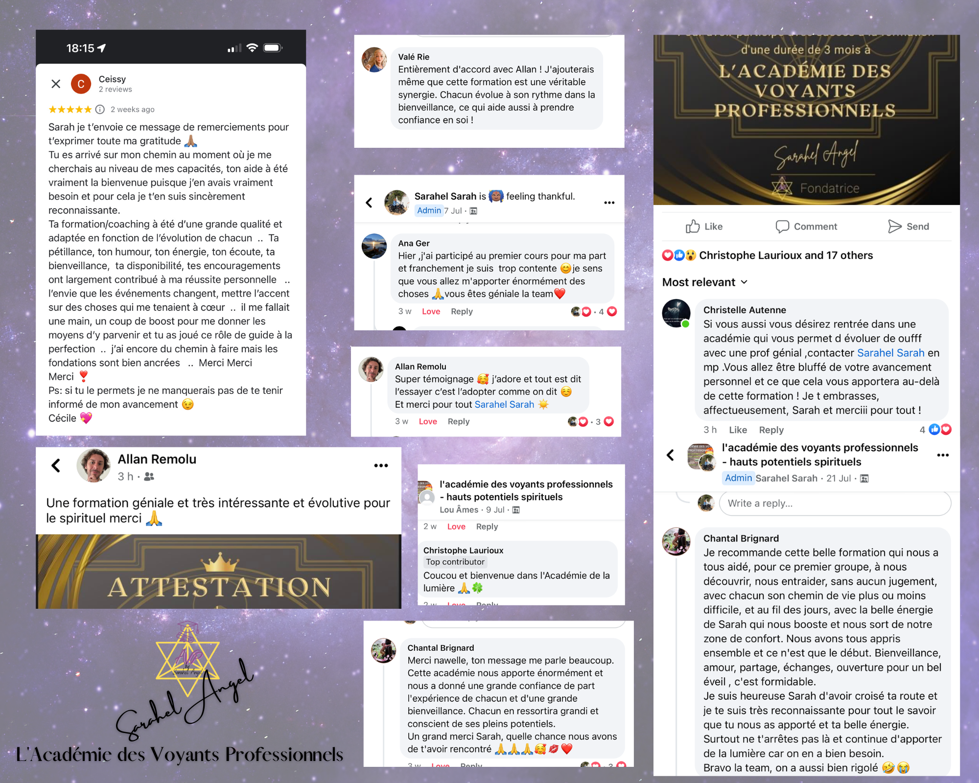 "Sarahel est une éveilleuse d'âme, elle a changé ma vie la faite progresser et évoluer depuis plusieurs années que nos routes se sont croisées. Aujourd'hui, j'ai intégré son Académie Des Voyants professionnels, elle amène chacun des participants à découvrir ses dons et sa mission de vie. Elle nous accompagne avec humanité, en nous permettant d'avancer avec sérénité. Elle éveille nos consciences à notre âme."