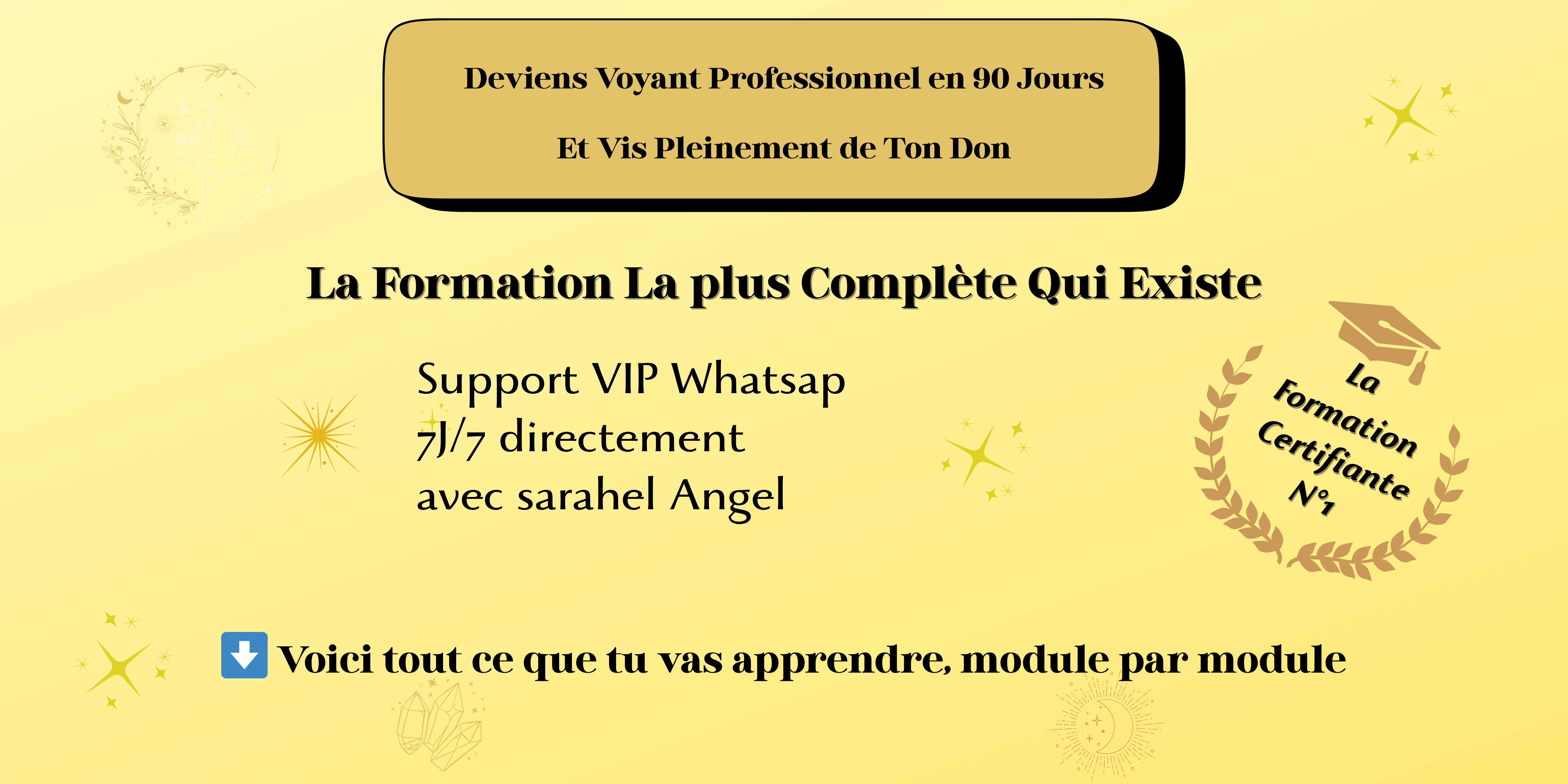 Avec cette formation, je vais t’éviter des années de recherches laborieuses à tâtonner dans le brouillard. J’ai balisé un chemin clair vers la réussite, pour que tu puisses avancer rapidement et avec confiance. Alors Transforme tes ressentis en véritables dons spirituels, libère-toi et vis de ta passion.