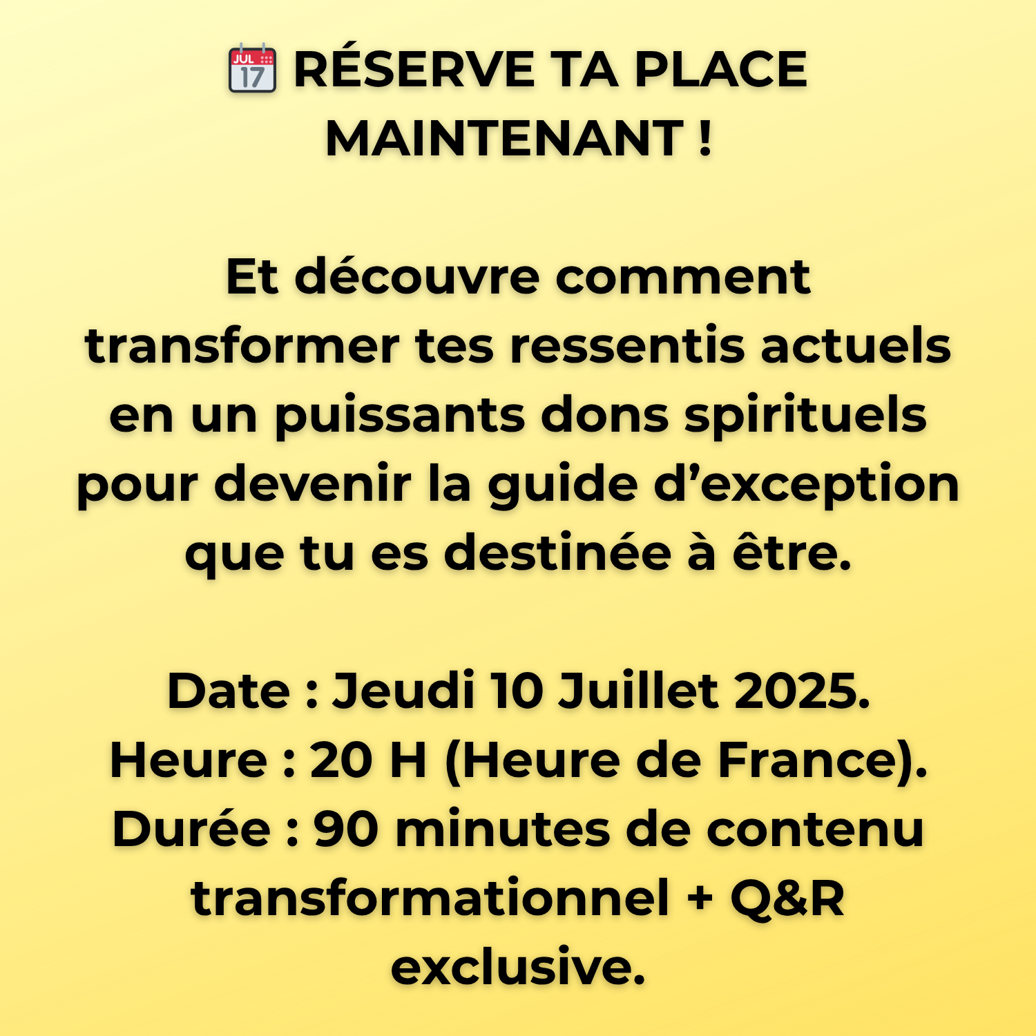Accède aux secrets jalousement gardés d'une voyante reconnue par les médias nationaux et internationaux qui a transformé la vie de milliers de personnes — et découvre comment transformer tes ressentis actuels en un puissant don spirituel pour devenir la guide d’exception que tu es destinée à être.